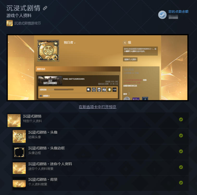 尽管积分商店多数套装需要数千积分解锁,但目前平台正在免费赠送名为"沉浸式剧情"的资料装扮组合包。该套装旨在配合10月21日至11月3日举办的同名游戏节,主打叙事驱动游戏与视觉小说。这套金色主题装饰含五件物品,包括一个动态胶片轮头像框。虽未明确免费期限,但活动极可能随游戏节于11月3日同步结束。