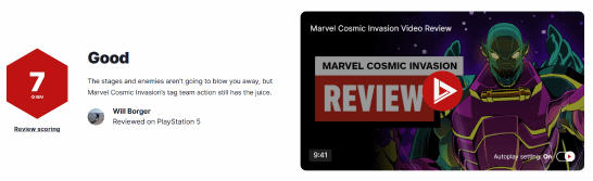 知名游戏评测媒体IGN对Tribute Games Inc.研发的横版清关动作游戏《漫威宇宙入侵》给出了7分的评价。测评者指出,这款游戏的关卡与敌人设计方面没有带来太大的创新突破,不过,其协同作战系统依旧具有可玩性,值得玩家们去尝试体验。