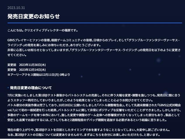 格斗游戏《碧蓝幻想Versus:崛起》宣布跳票,发售日从原来的11月30日延期至12月14日发售,登陆PS5、PS4、Steam平台。该作将于《碧蓝幻想Versus:崛起》第二次公开Beta测试将于11月10日至11月13日举行。