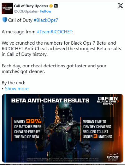 《使命召唤》发行商动视暴雪宣布,其专属反作弊系统“Ricochet”在近期《使命召唤:黑色行动7》的公开测试中创下了系列历史最佳成绩。本次测试于10月2日至9日期间进行,让玩家能在11月14日正式发售前抢先体验游戏。尽管测试初期曾出现作弊者入侵多人对战的情况,但动视宣称测试结束时已有近99%的对战房间完全杜绝作弊行为。