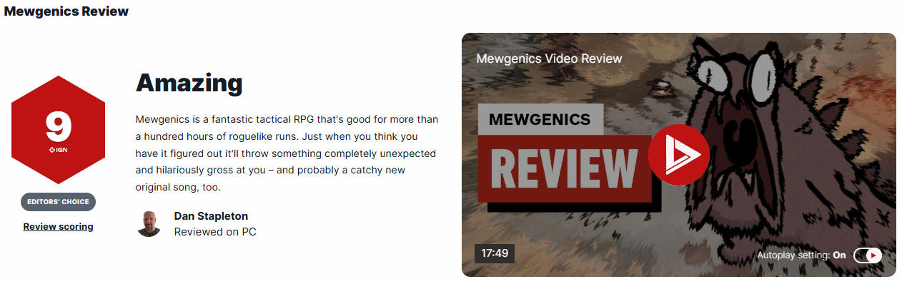 IGN简评:《喵喵的结合》是一款出色的战术角色扮演游戏,能让你体验超过一百小时的类Rogue挑战。就在你以为已经完全掌握游戏的时候,它会突然给你来点完全出乎意料且令人捧腹的事物——还可能附带一首朗朗上口的新原创歌曲。