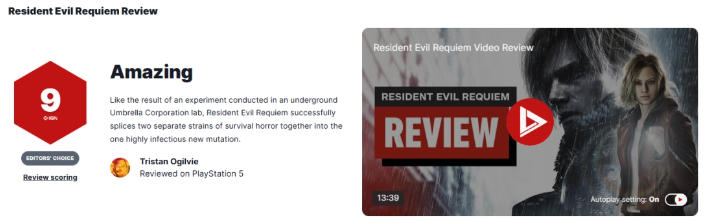 《生化危机9:安魂曲》媒体评分已解禁,外媒IGN打出9分好评。IGN认为如同保护伞公司地下实验室里一场实验的产物,《生化危机9》成功将两种截然不同的生存恐怖病毒株融合,诞生出具有高度传染性的全新变异体。