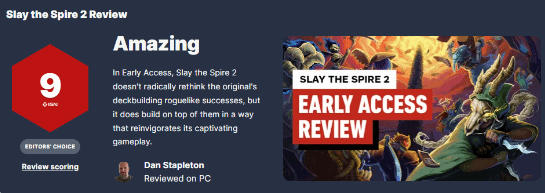 IGN发布卡牌构筑Roguelike游戏《杀戮尖塔2》评测文章,打出了9分的高分评价。